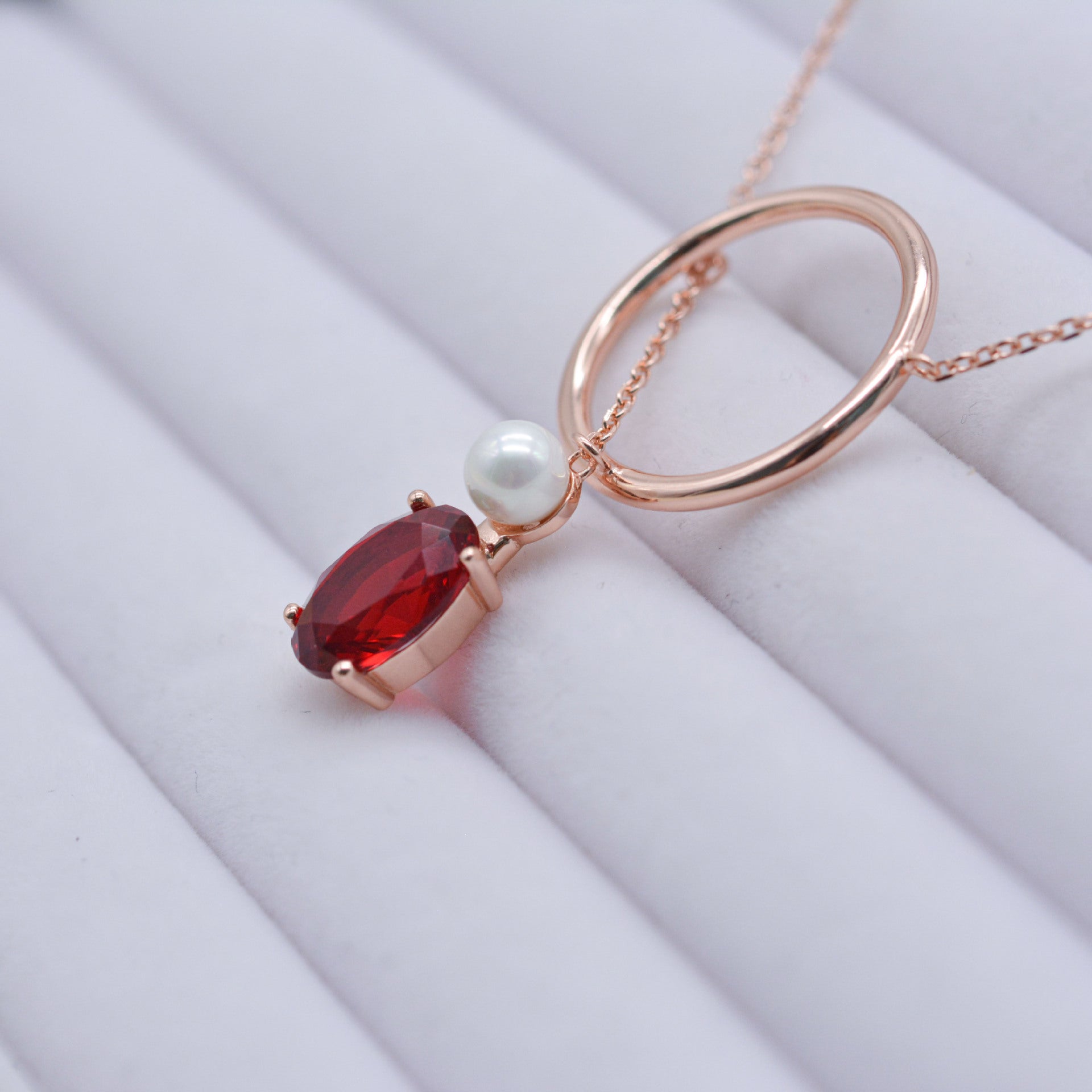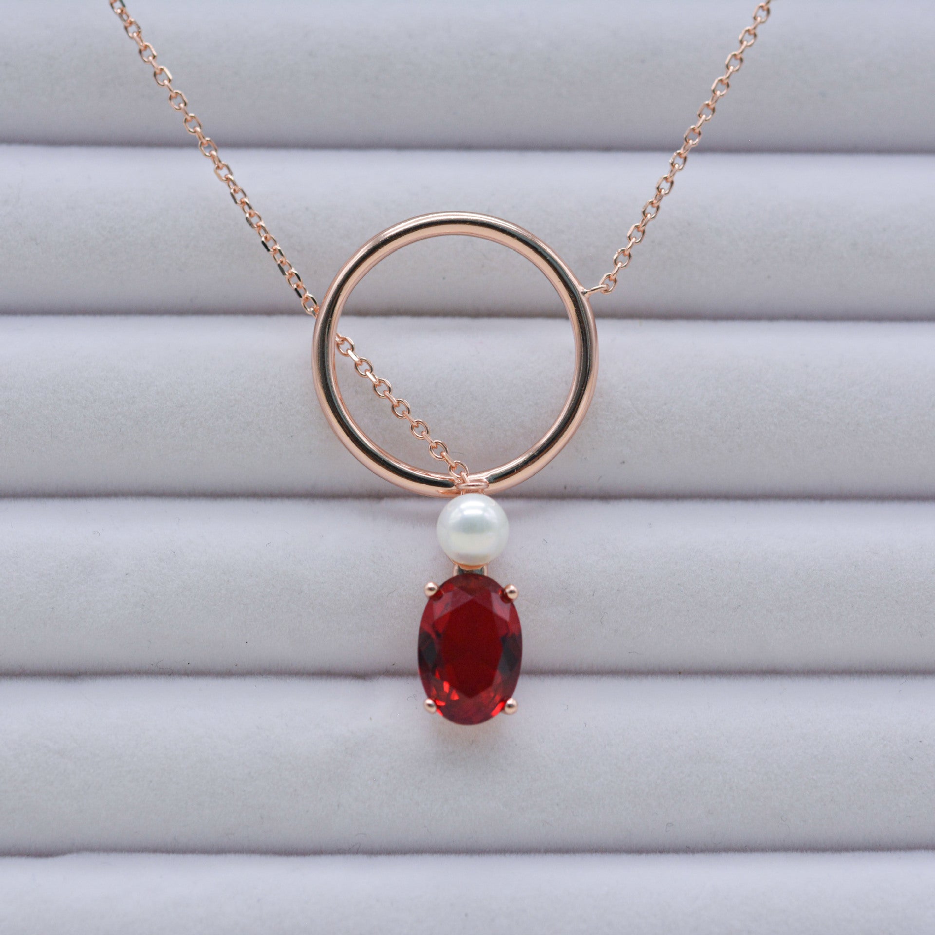 Radiating elegance and passion, the Emmelina Ruby Necklace features a lustrous rose gold circle pendant adorned with a delicate pearl and a vivid, oval-cut ruby. The striking red gemstone symbolizes love and vitality, while the minimalist circular design conveys harmony and eternity. Perfect for special occasions or as a heartfelt gift, this necklace adds a timeless, romantic charm to any look.