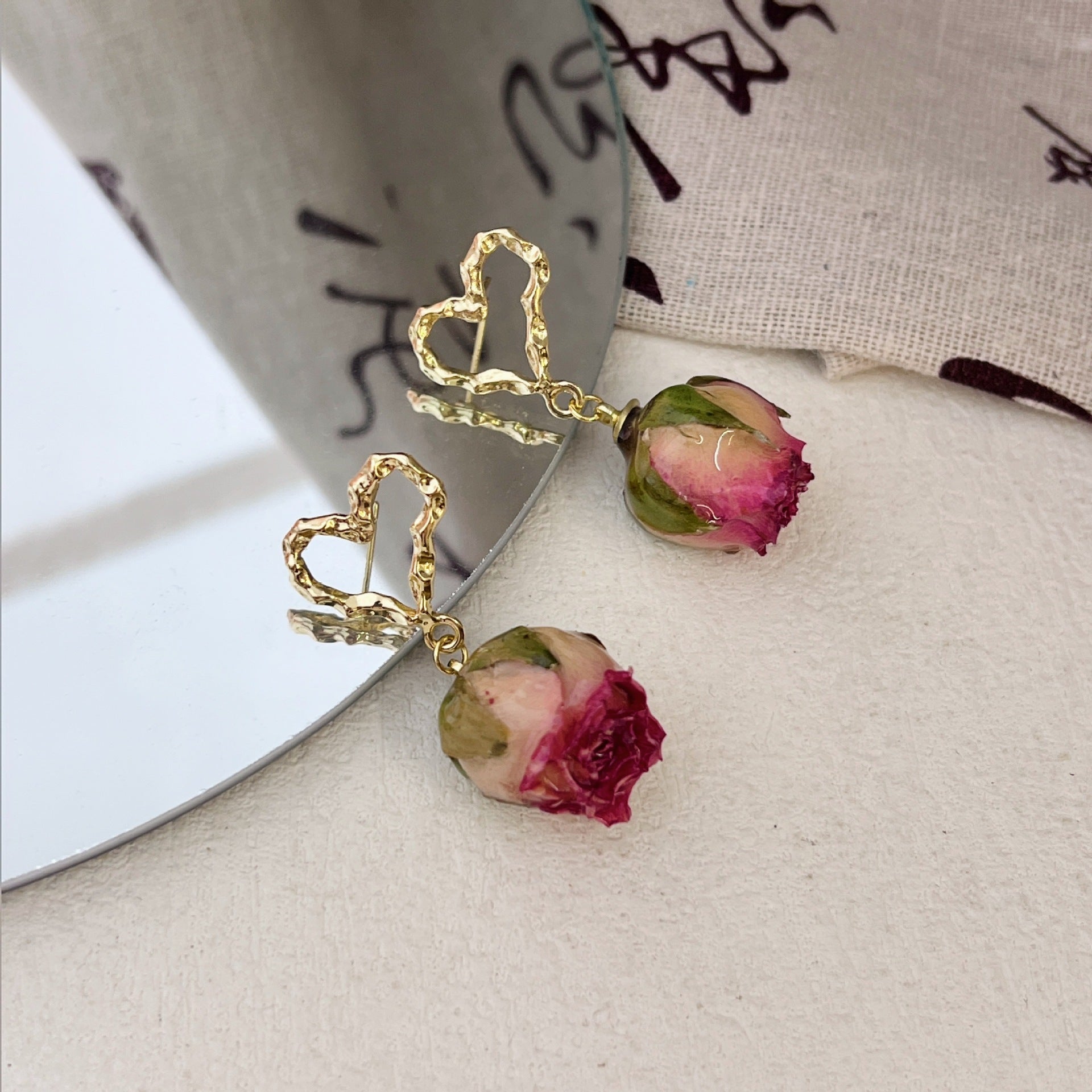 Features realistic dried rose blooms preserved with leaves attached, crafted into delicate earring forms. Each rose is carefully selected, prepared and mounted to maintain allure and fine details after drying. Bringing a sense of rustic romance, these unique earrings showcase preserved floral artistry through wearable mementos for all seasons.Suitable for all occasions from casual to semi-formal events as a classic ornament.